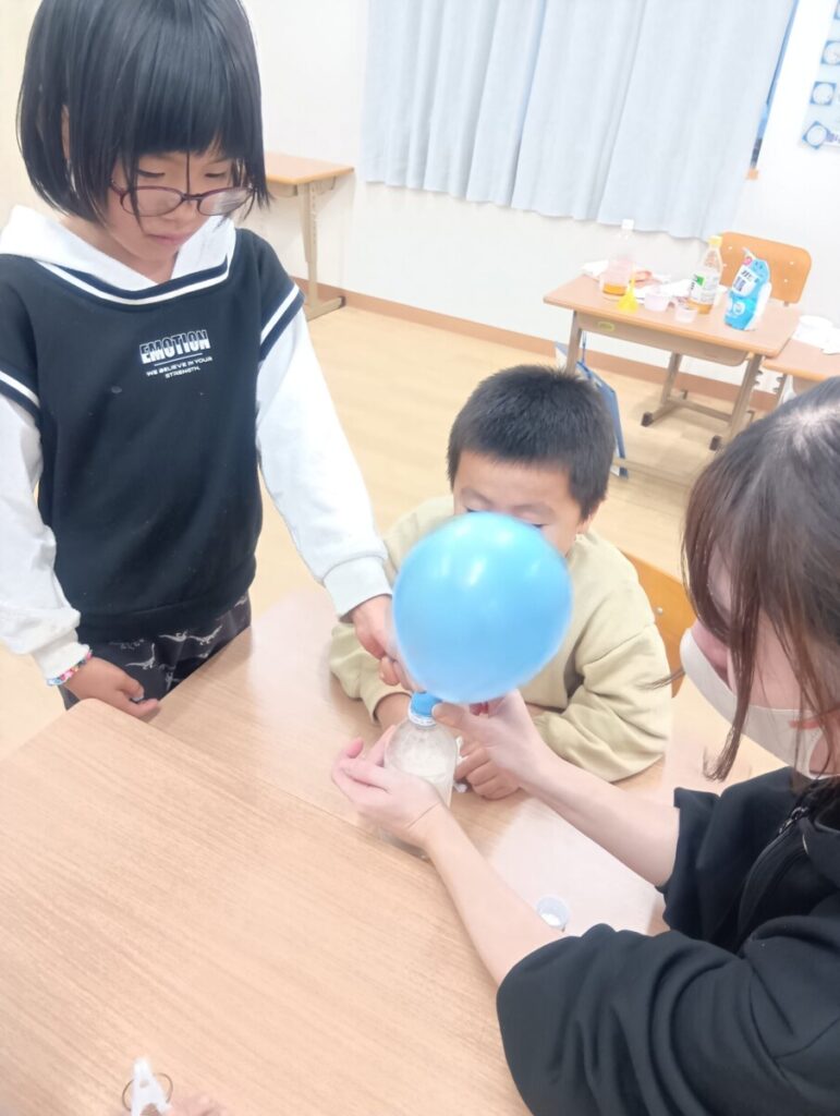 チーム内で役割分担を決め、重曹の量を測る人や風船をペットボトルに装着する人などお友達と相談しながら決めることができました!!