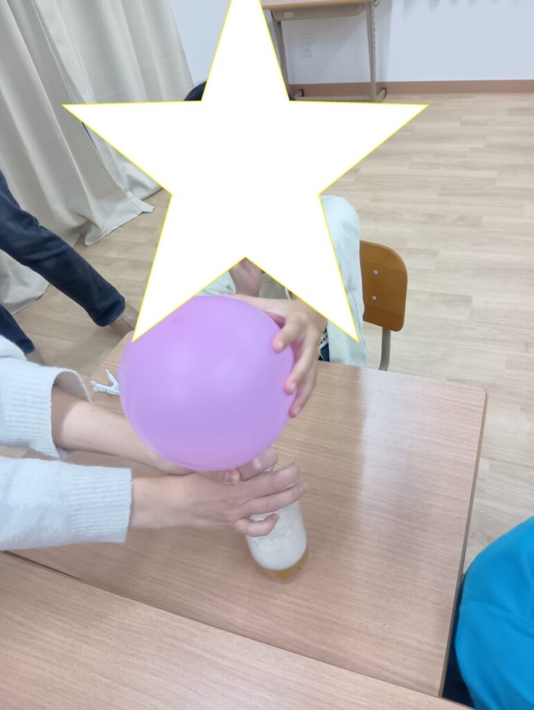 規定量を測ることや、ペットボトルに入れるときや風船をかぶせるときに友達に抑えてもらったり、声を掛け合いながら協力して取り組むことをねらいとして取り組みました😊