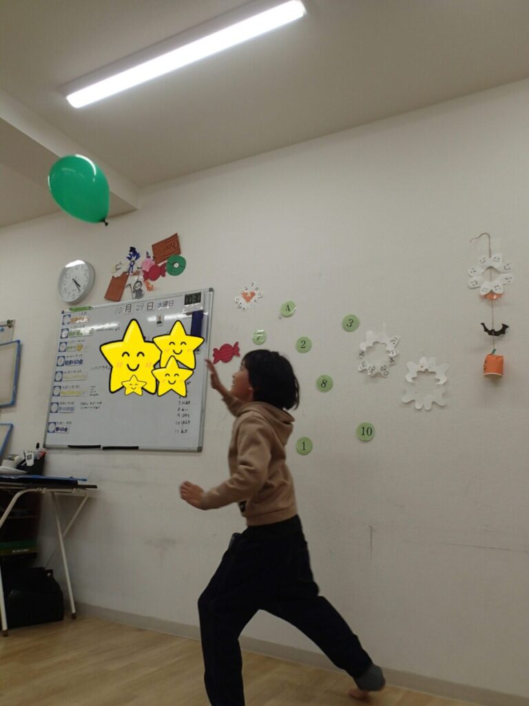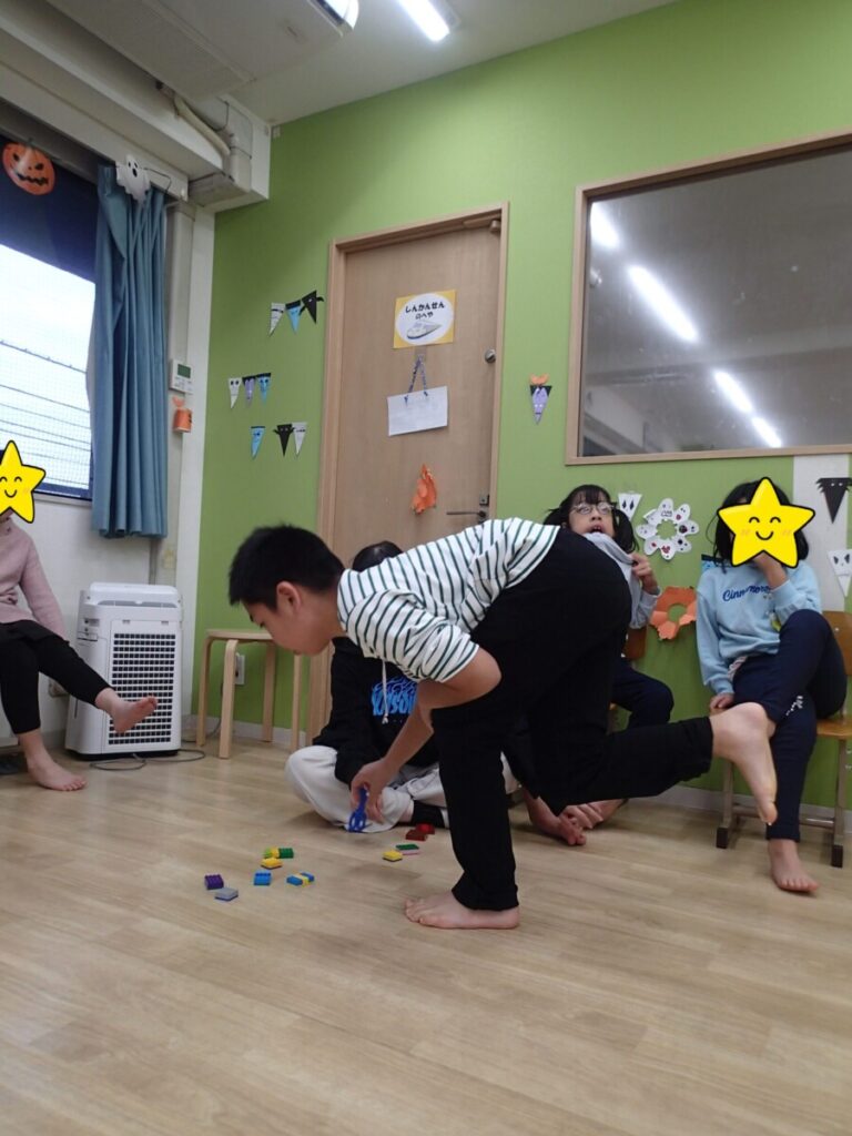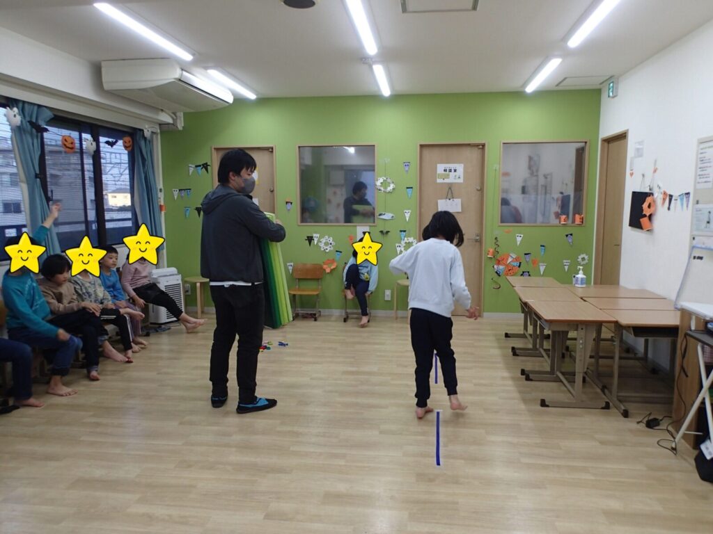 最初の2種目は「片足ケンケン」と「片足のまま洗濯ばさみでおもちゃ拾い」です!不安定な状態で細かい作業をする課題に、子どもたちは大奮闘!「職員を所定の所まで押す手押し相撲」で力試しも行い、「風船トスと壁の数字タッチ」は協調性と空間把握能力が同時に試され、難易度満点でした!高学年生には制限時間30秒でタイムアタック!「出来ない!」と言っていた子どもも真剣に取り組むうちに夢中になり、最後はみんな笑顔でゴールしていました!