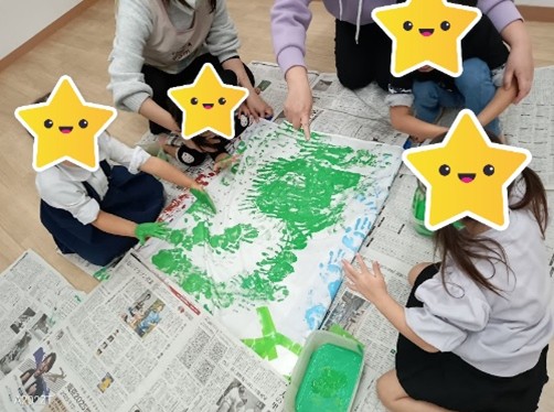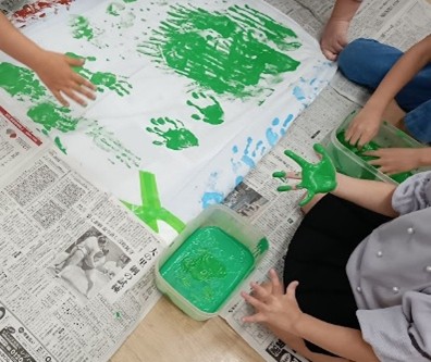 今年のテーマ「みんなの宝物」からイメージを膨らませ、分担しながら大きな布に絵を描きました!児童発達支援のお友達は、手形で空や緑をつくってくれました!みんなで協力して大きな布に色をつけていきます。