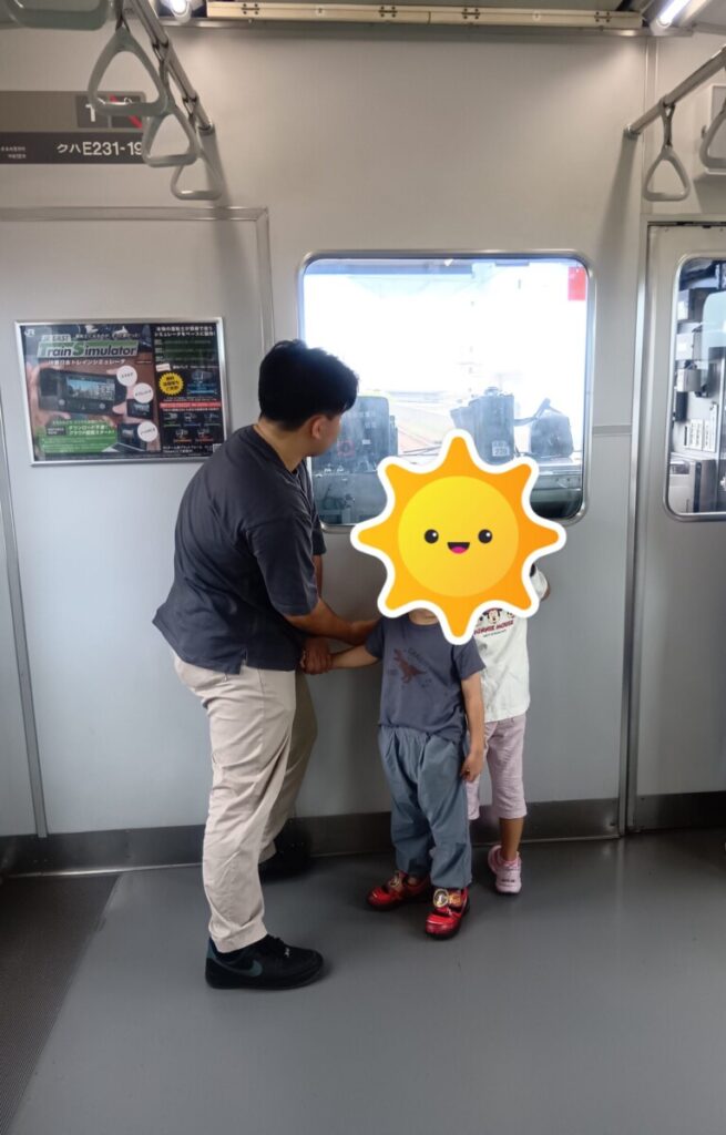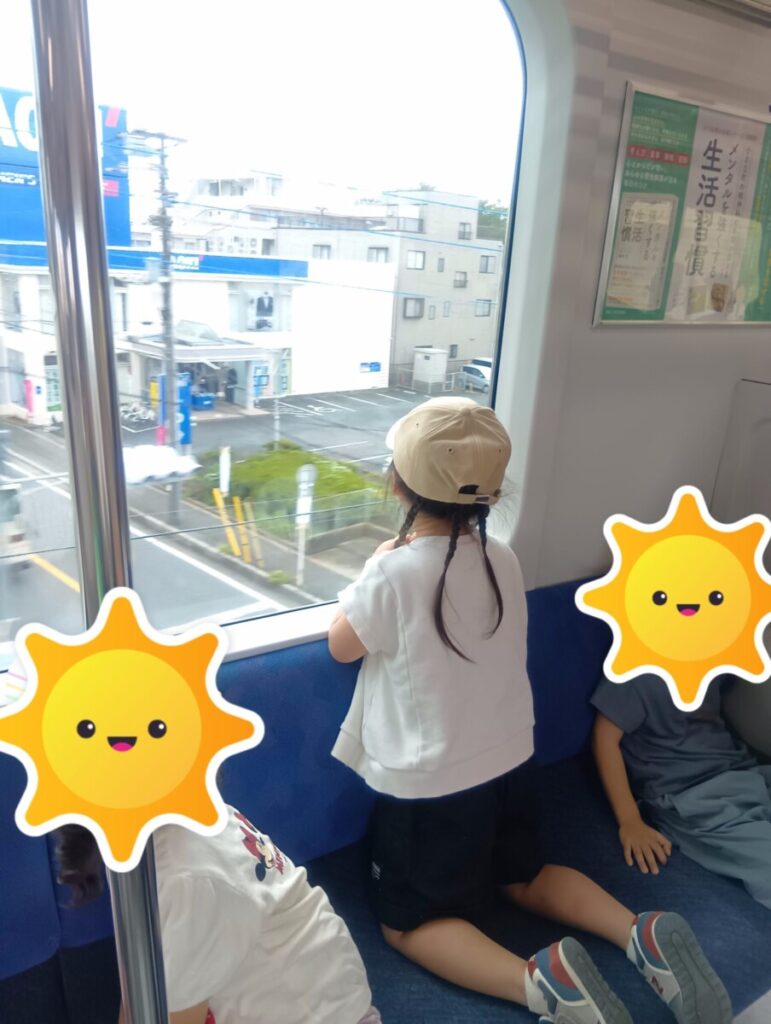 電車の中では、一番前の車両に乗ったため、車掌さんがいる運転席を興味津々そうに見ているお友達や椅子に座りながら外の景色を見ているお友達もいました!!
