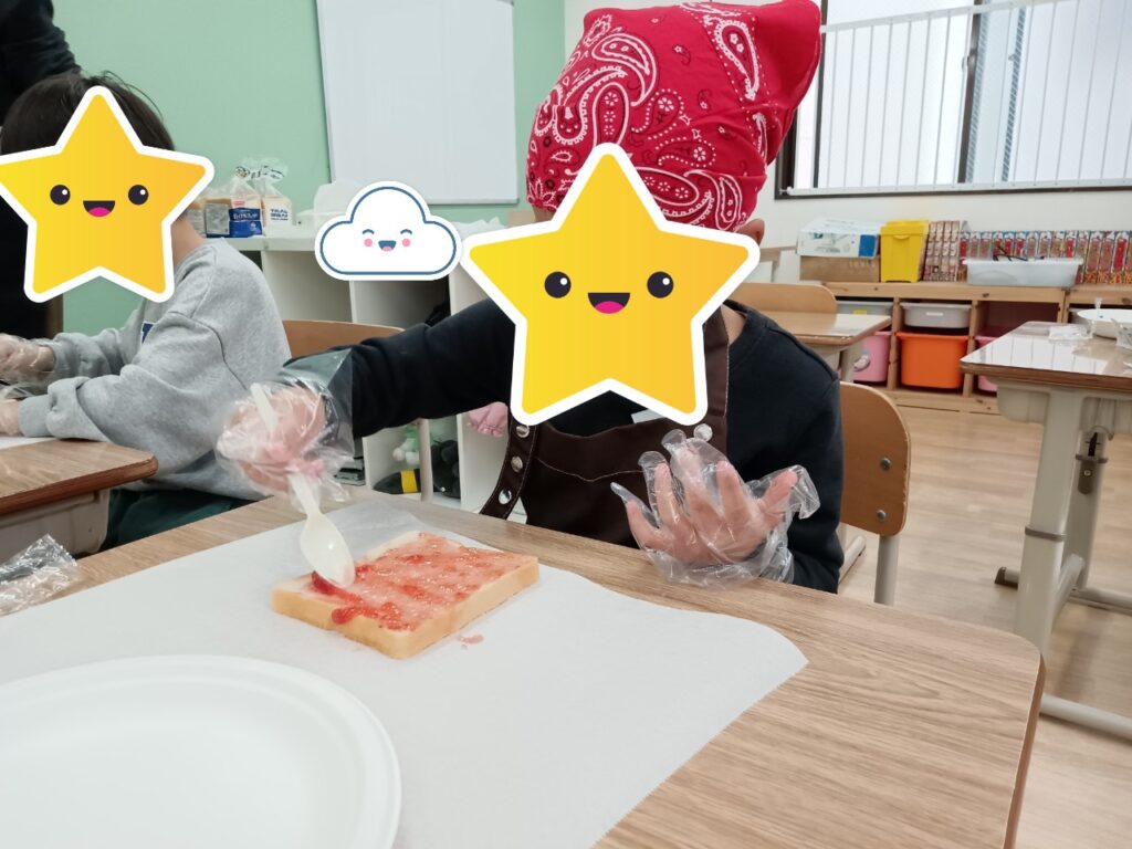 ジャムを塗ったり、ハムを乗せたり、パンを切ったりしました。